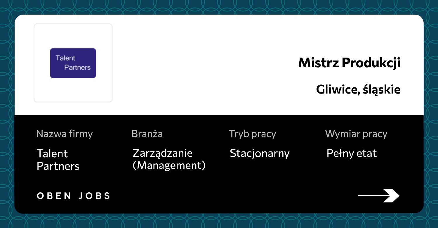Oben Jobs jest platformą rekrutacyjną, należącą do agencji zatrudnienia Oben & Company. Publikujemy wyłącznie oferty pracy od pracodawców, którzy powierzyli nam misję realizacji kompleksowej usługi rekrutacyjnej (Recruitment Process Outsourcing) lub pojedynczych projektów. Dzięki temu, dbamy o wysoką jakość publikowanych ofert pracy, efektywność pozyskiwania talentów, a także sprawną komunikację pomiędzy potencjalnymi i aplikującymi kandydatami. W razie jakichikolwiek pytań dotyczących ofert(y) pracy, czuj się swobodnie w kontakcie z nami. Informujemy, iż po naciśnięciu przycisku Aplikuj zostaniesz przekierowany do zewnętrznego formularza aplikacyjnego (ATS). Dzięki temu, Twoje dane są bezpieczne.