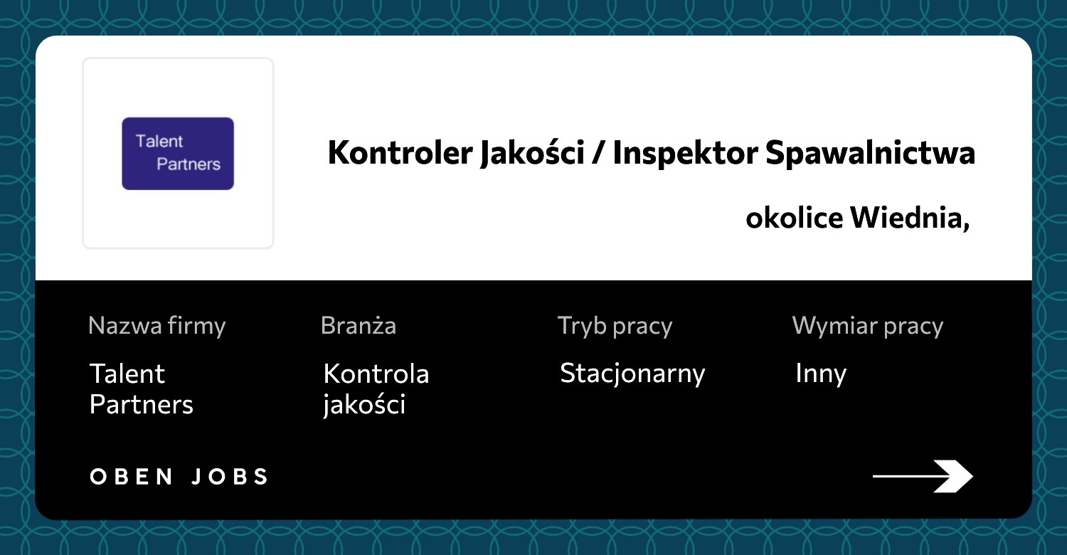 Dla naszego Klienta – stabilnej firmy zajmującej się kontrolą jakości w branży metalowej na terenie Austrii – poszukujemy kandydatów na stanowisko: Kontroler Jakości / Inspektor Spawalnictwa (Nr ref. KJA/17210).